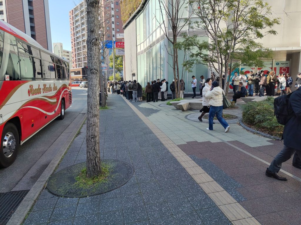 Ausgecheckt, dann ging es los zum Flughafen. Das Hotel war unbemannt, es gab nur einen kurzen Video all zum Check-In. Der Weg war nicht weit und ich hatte ein wenig Zeit, also bin ich den Tag gemütlich angegangen. Brauche ich auch nach den anstrengenden Tagen. Heißen Kaffe aus dem Automaten. An einem Restaurant, The Full Full Hakata, vorbei, die Schlange ging um den halben Block. Den vorderen Teil habe ich leider nicht fotografiert. Ich verstehe nicht wieso man sich da überhaupt noch anstellt.