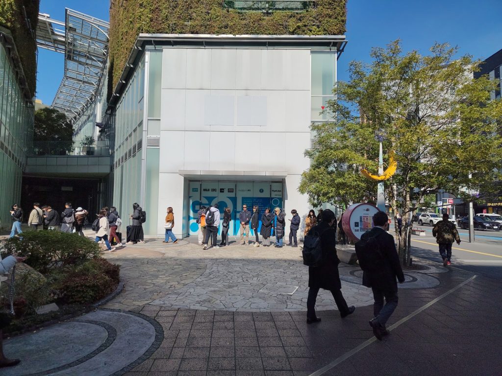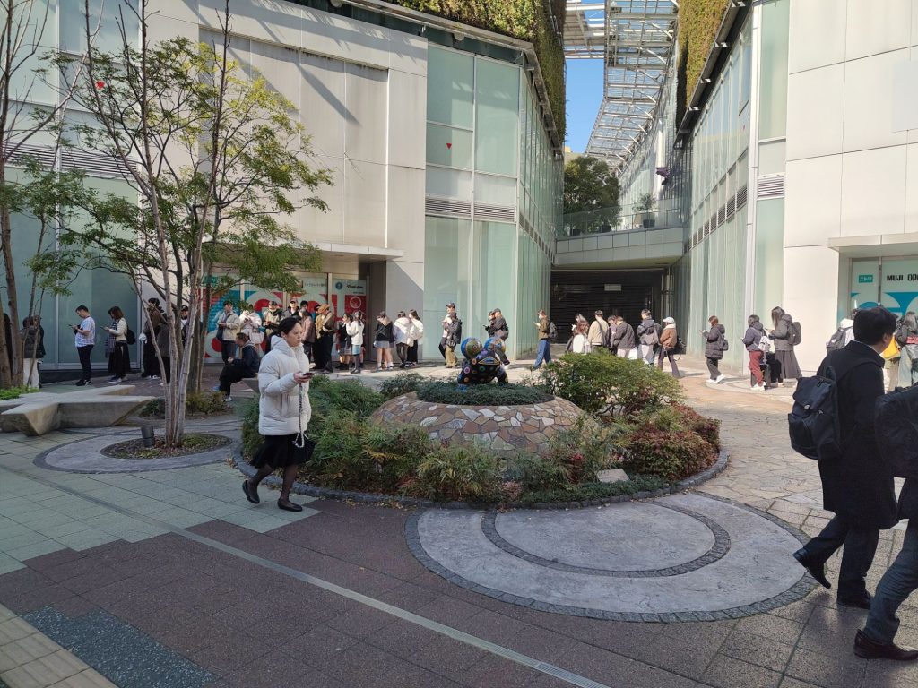 Für Frühstück habe ich mich dann für Okonomiyaki entschieden, da ich zufälligerweise einen vielversprechenden Laden gesehen habe, direkt hinter dem Kirby-Café. Jetzt hab ich mich sogar dafür angestellt. Geht hoffentlich nicht so lange. Aber der Ichiran Ramen Laden direkt daneben hat eine viel längere Schlange.