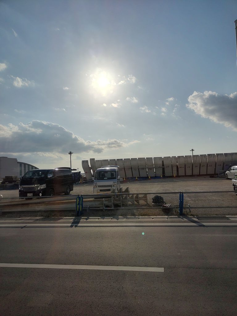 Auf dem Weg zum Bus schnell im Konbini trinken und Onigiri geholt, dann auf zum Bus. Der fuhr zur Fähre, mit der es nach Nokonoshima, eine Insel, ging.