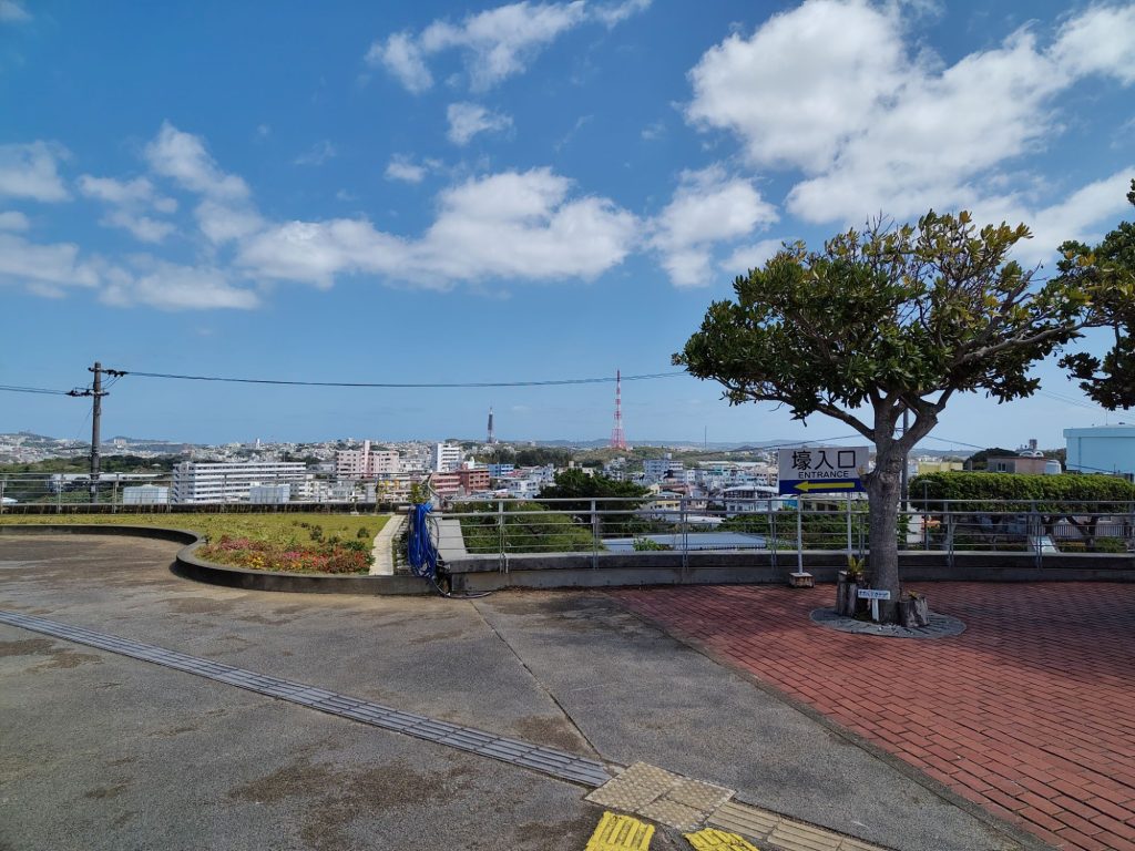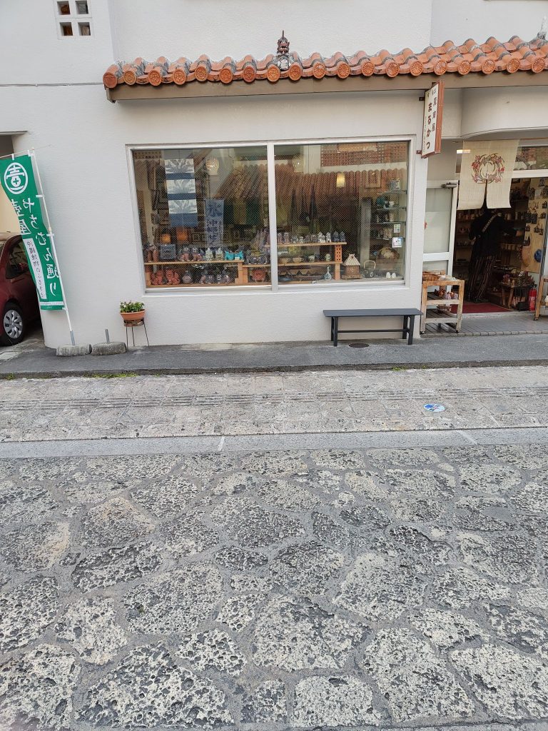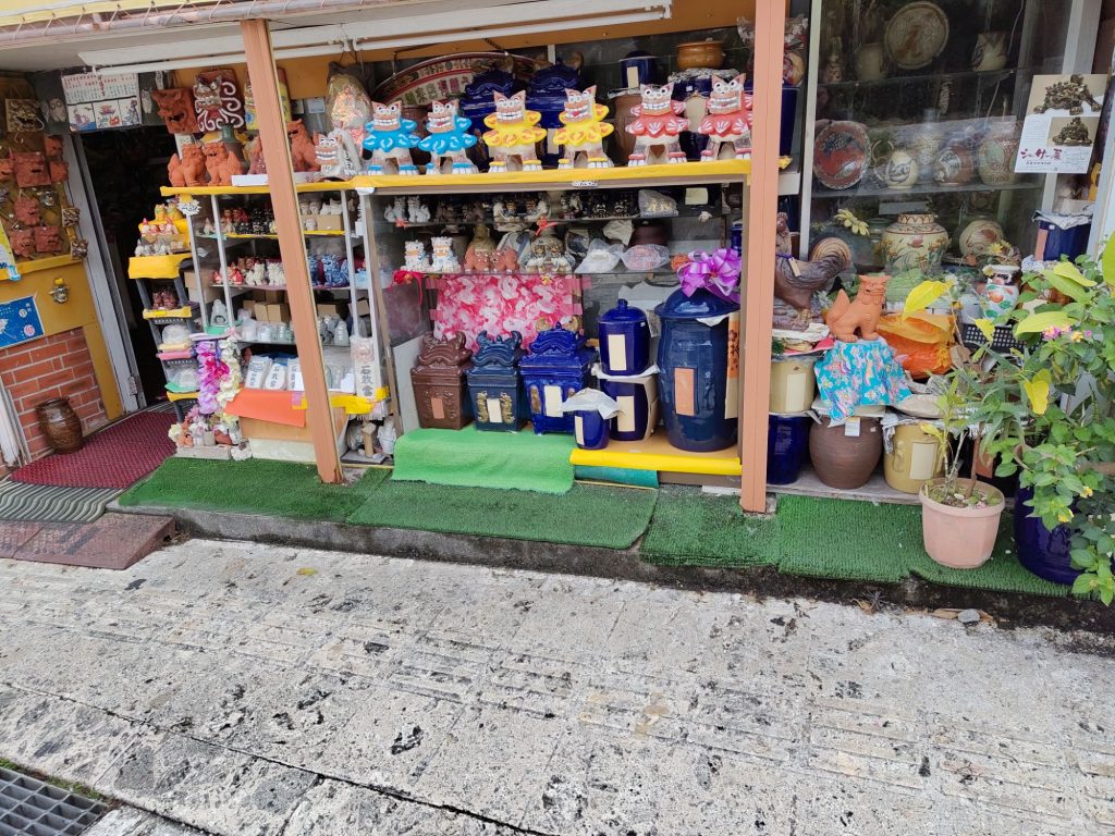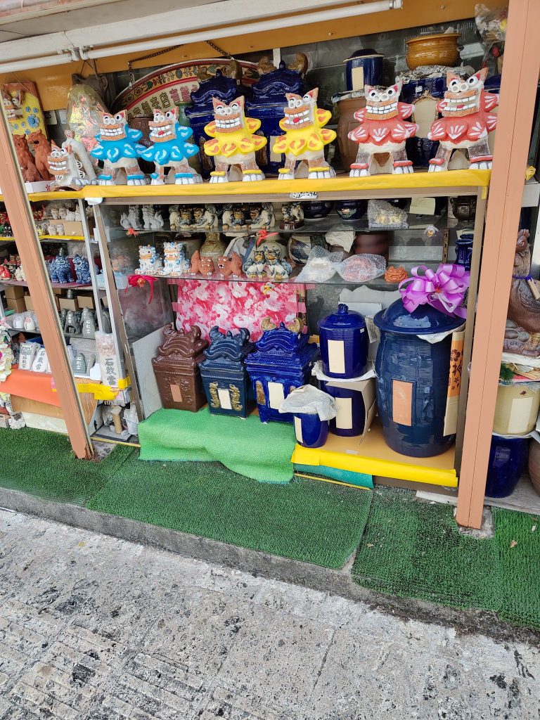 Auf dem Weg bin ich aus Versehen durch eine Straße gelaufen, die auch auf meiner Liste stand, die Tsuboya Yachimun Street, lauter Keramik-Läden. War ganz nett, aber hat mich nicht so sehr beeindruckt. Dahinter noch ein Park. Vor dem Garten war bei Google Maps eine riesige Grünflache, die sich als riesiger Friedhof herausstellte.