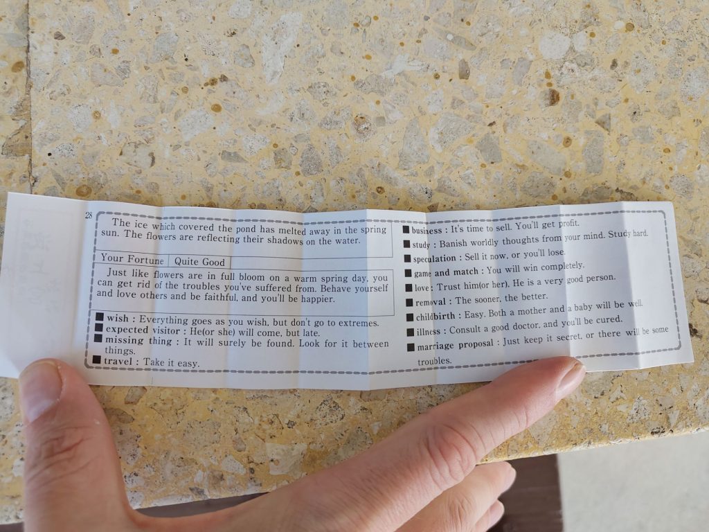 Als nächstes der Tochoji-Tempel, nur ein paar Meter weiter nördlich. Hier konnte ich mir ein Omikuji, ein Zettel, der einem sein Glück vorhersagt kaufen. Ich hab einfach nur „Glück“ gezogen. Es gibt ein paar Stufen drüber aber auch drunter, „Curse“ bzw Pech. Danach bin ich wohl „durch die Hölle gegangen“, im Tempel war ein Durchweg, bei dem erst Bilder Dämonen in der Hölle dargestellt waren. Danach wurde der Gang komplett dunkel, man sah nichts mehr und musste tasten, da der Gang gewunden war. Irgendwann kam ein Bild mit Buddhas, welches hell erleuchtet war. Dies stellt wohl den Gang durch die Hölle und die Erleuchtung dar. Spannende Erfahrung. Außerdem gab es einen recht grossen Holzbuddha zu sehen. Leider waren keine Fotos erlaubt. Dahinter befanden sich noch weiter kleine Tempel und Schreibe und Friedhöfe. Alle habe ich mir nicht angesehen, da diese Recht klein und sehr ähnlich waren.