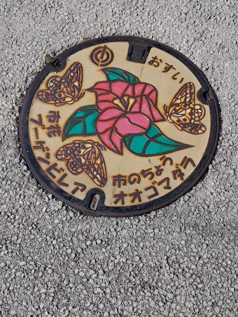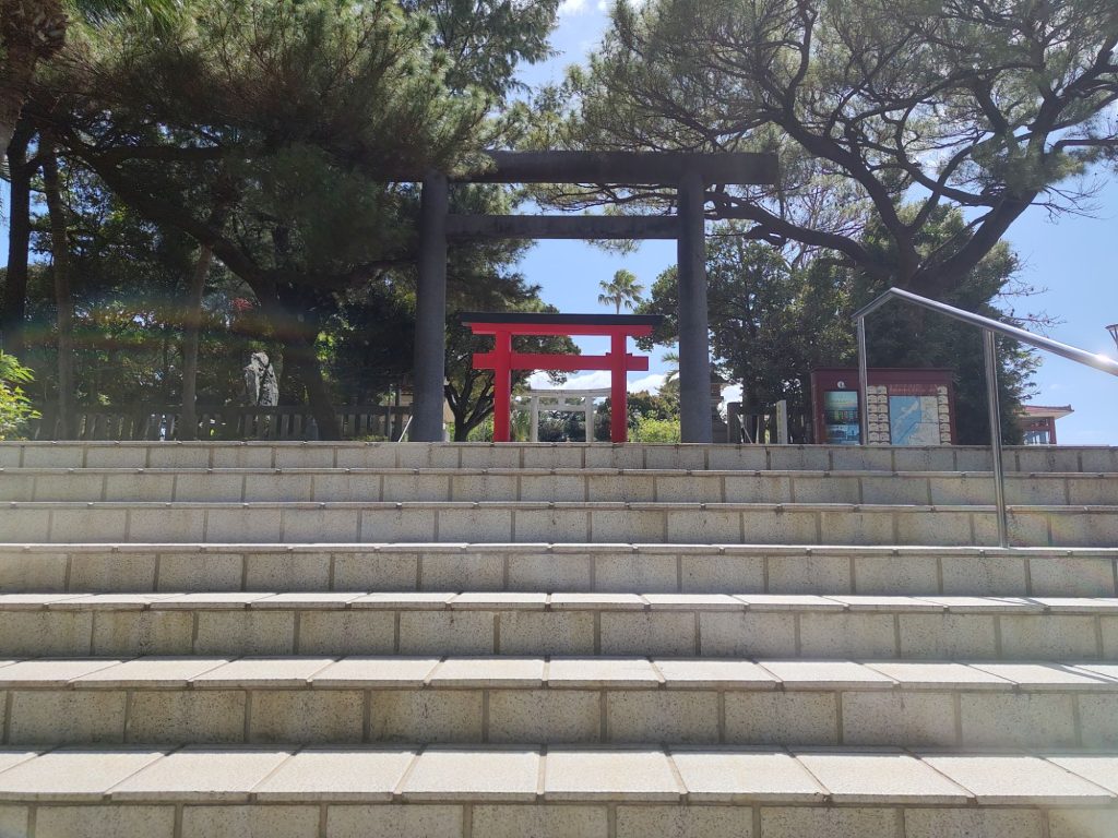 Danach ging’s durch den Rainbow Pine Grove, bei dem ich irgendwann Angst hatte, ich müsse wieder umdrehen, weil der Weg bei Google Maps in echt so aussah, als dürfen da später nur noch Autos entlang (konnte es ohne Internet ja nicht prüfen). Aber schöner und länger Wald. Das Wetter ist übrigens seit dem Schloss T-Shirt-Wetter. Und zum Glück funktionierte mein Weg, auch wenn ich kurz durch „wilden“ Wald musste. Nächster Punkt: Kagamiyama und Kaution Shopping Center. Kagamiyama und das riesige Toori unten waren beeindruckend, auf das Observationsdeck (auch ein Handlungsort) wollte ich dann doch nicht, da der Weg nach Serpentinen aussah und wohl auch besser mit Auto bewältigt wird? Ich weiss es nicht, und aus Zeit- und Höhenangstgründen habe ich es auch nicht herausgefunden (laut Google zu Fuß eine Stunde hoch).