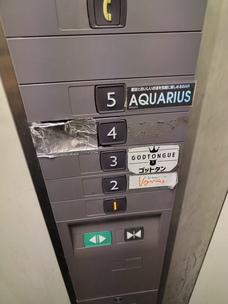 Der Name des Ladens war überklebt und die Treppen zum Stockwerk drüber und drunter abgesperrt.Hier im dritten Stock (bzw. Im japanischen 4. Stock) war die Party.