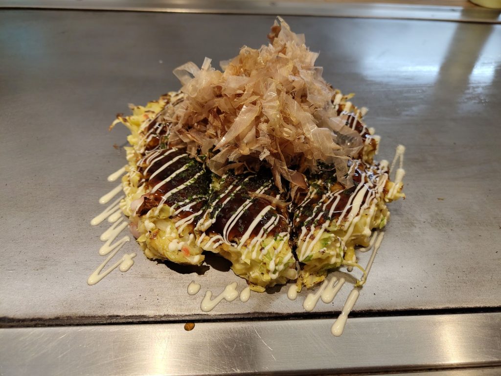 15 Minuten musste ich warten, dafür kam dann auch schon zeitnah das Essen. Der Laden heißt Denko-Seppa, ich habe das gleichnamige Okonomiyaki genommen. Ist Hiroshima-Style, das hatte ich tatsächlich schon mal in Hiroshima.