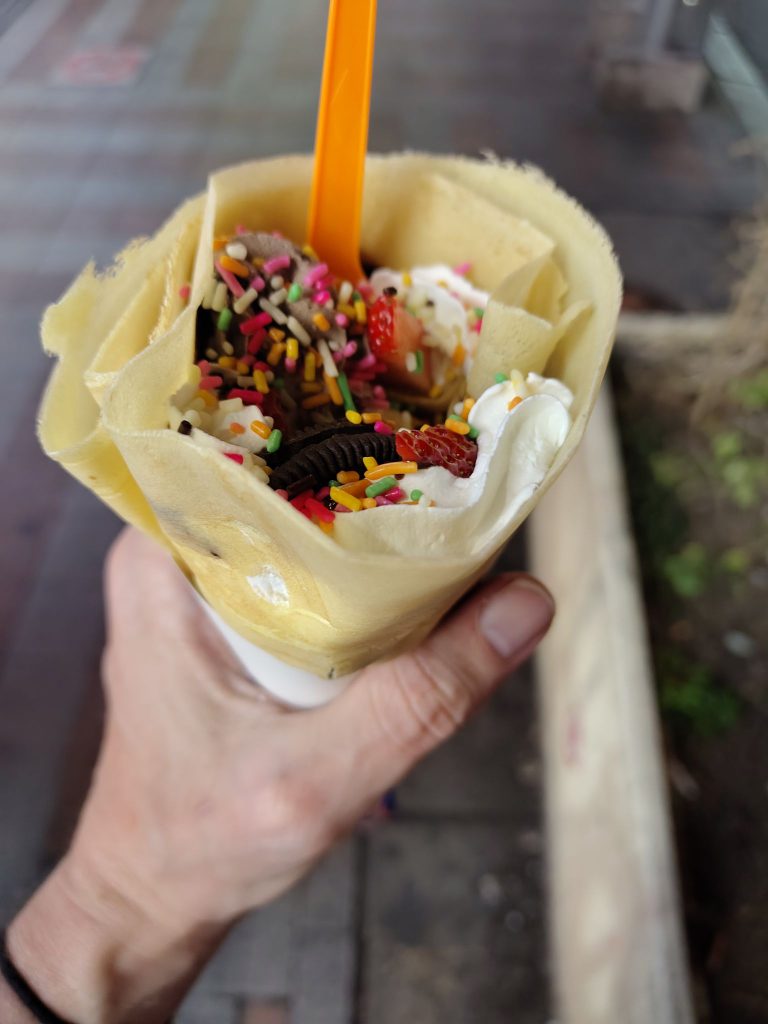 Der Sonnenuntergang soll hier sehr beliebt sein. Hinter den Wolken dachte ich mir, dass es sich nicht lohnt zu warten Ein Crepe auf dem Rückweg mit Erdbeeren, Oreo und Eis.