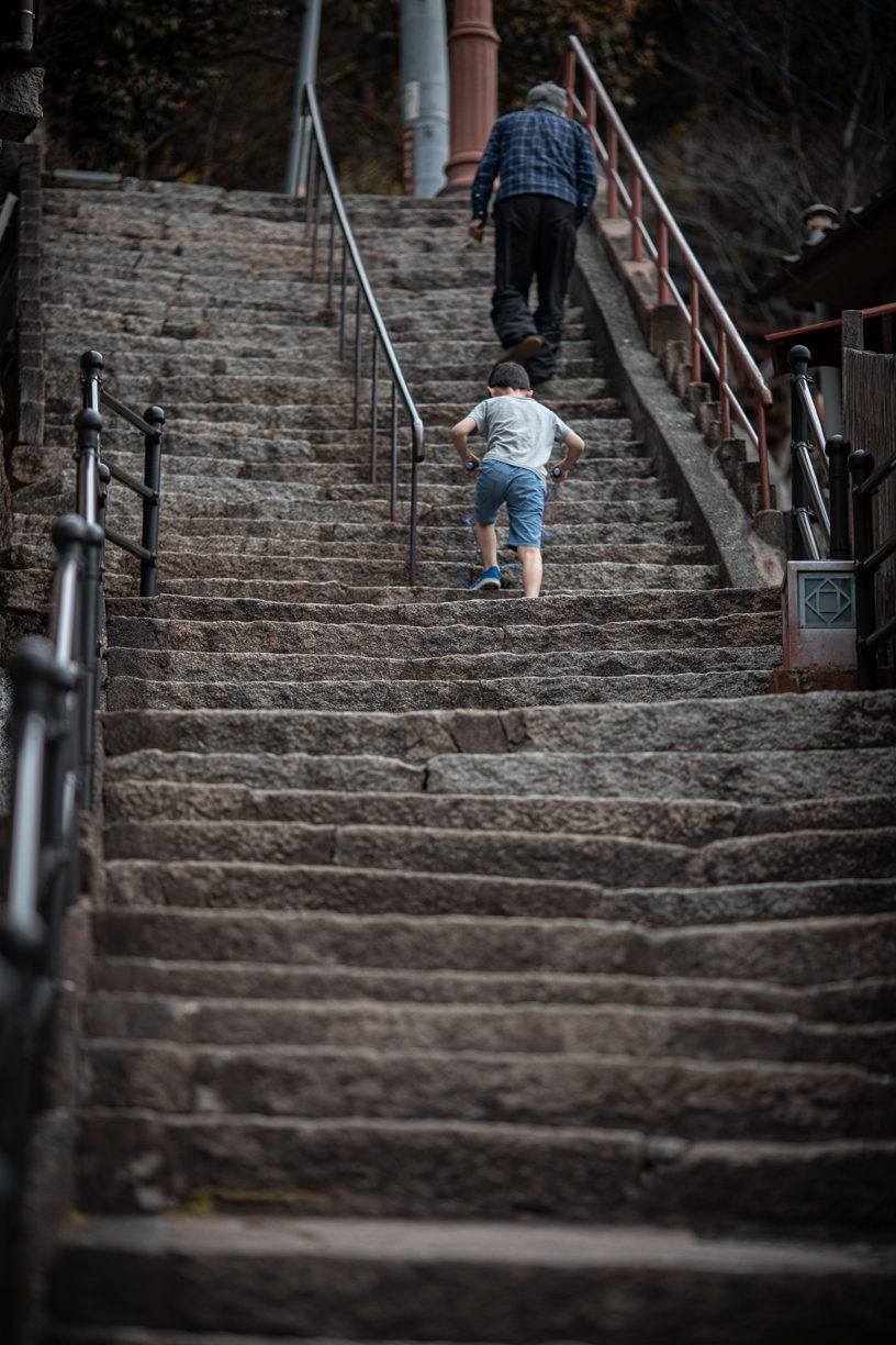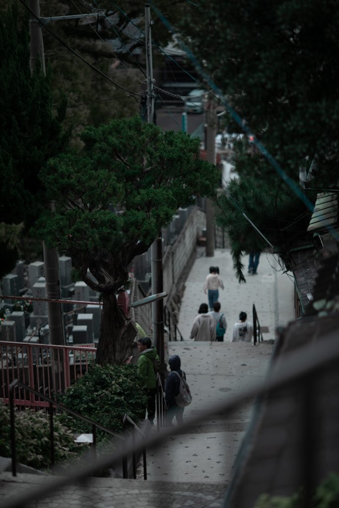 Katzen waren in dieser Stadt also echt viele vorhanden. Auch dir Katzenlady von vorhin kam kurz vorbei und hat uns gegrüßt. Als wir uns endlich losreißen konnten, sind wir zu einer kleinen (wirklich kleinen) Bäckerei namens nekonotepan gegangen, was übersetzt soviel wie Katzentatzenbrot heisst. über diese hatte Mira schon im Internet gelesen. Wir haben ein paar Sachen probiert und besonders das Käsebrötchen war echt lecker. Hier ist zu sagen, das Japaner einfach kein Brot machen können. Die einzigen Backwaren sind alle sehr weich und meiner Meinung nach nicht lecker. Die Backwaren aus dem Laden waren mit unseren deutschen Backwaren zu vergleichen, gutes leckeres Brot mit Kruste, wo man auch ein bisschen beißen muss! Ich bin unser Brot zwar noch gewohnt, aber für Mira muss das echt toll gewesen sein. Die Bäckerei war trotz ihrer kleinen Größe auch sehr beliebt. Vor allem lag sie nicht offensichtlich am Weg, trotzdem mussten wir eine Weile warten bis wir drankamen. Auf unserem Weg sind wir natürlich auch an ein paar Schreinen vorbeigekommen, diese waren alle nett, aber nicht besonders erwähnenswert. Auffälliger fand ich das wir an fast genauso vielen Friedhöfen vorbeikamen. Da das Wetter nicht so gut war und diese Höhenmeter auf Dauer auch anstrengend wurden, wollten wir noch den nächsten Schrein besuchen und dann langsam umkehren. Hier erwartete uns aber erstmal eine ganze Menge Treppen, die steil hochgingen.