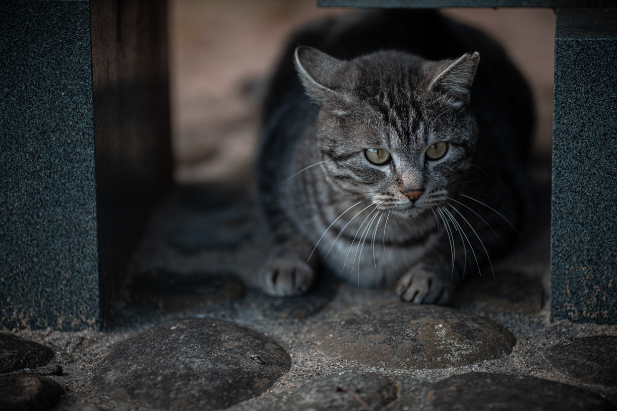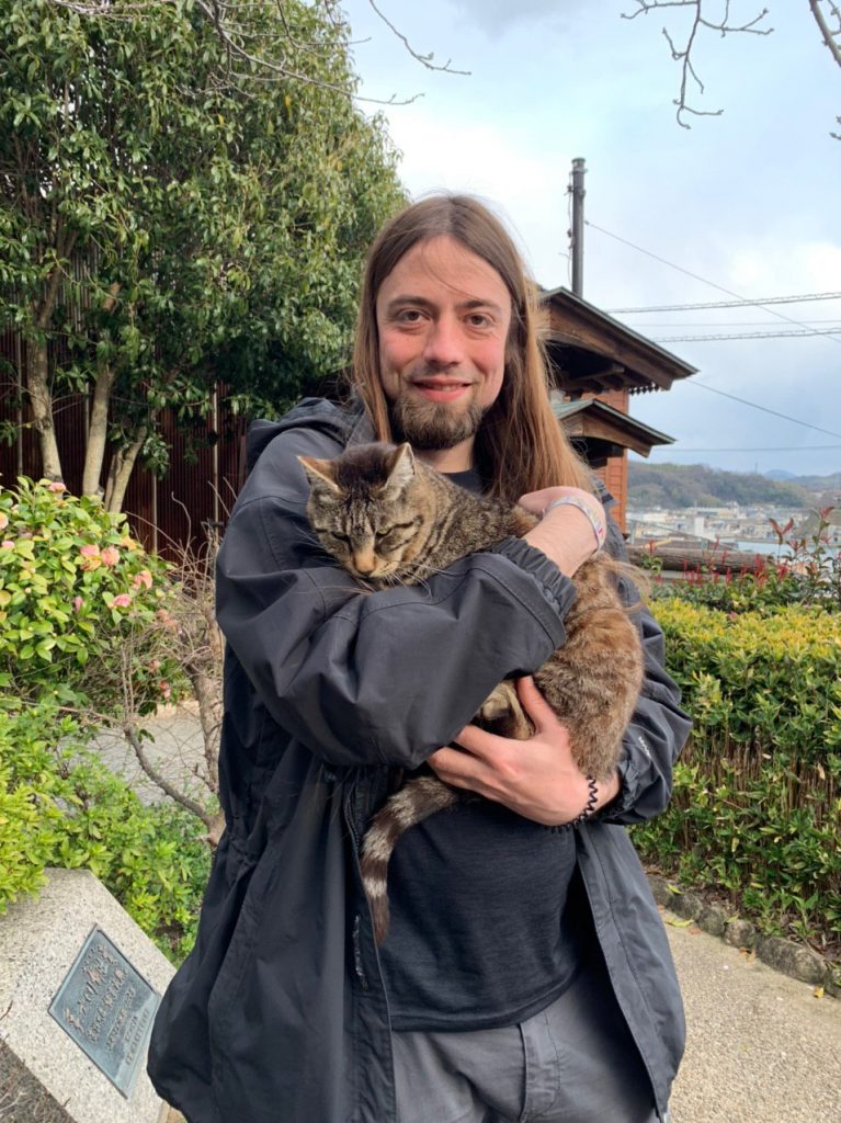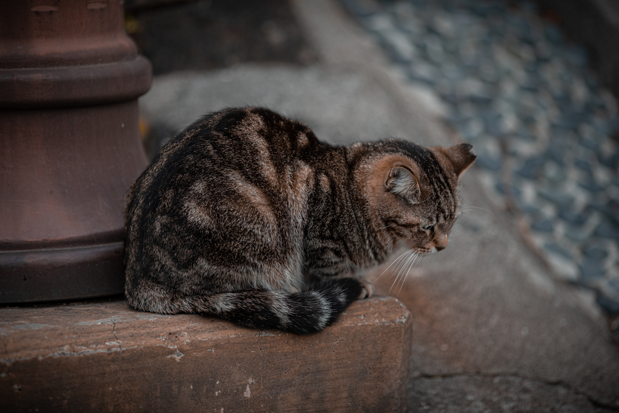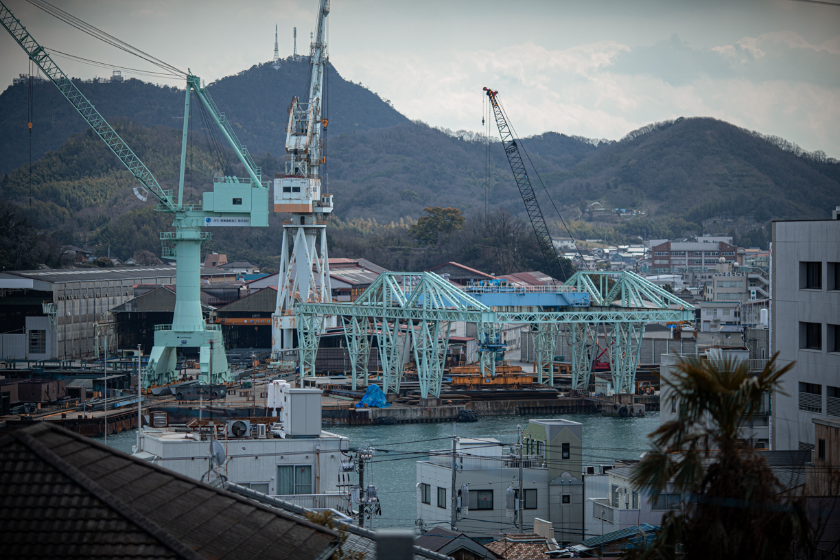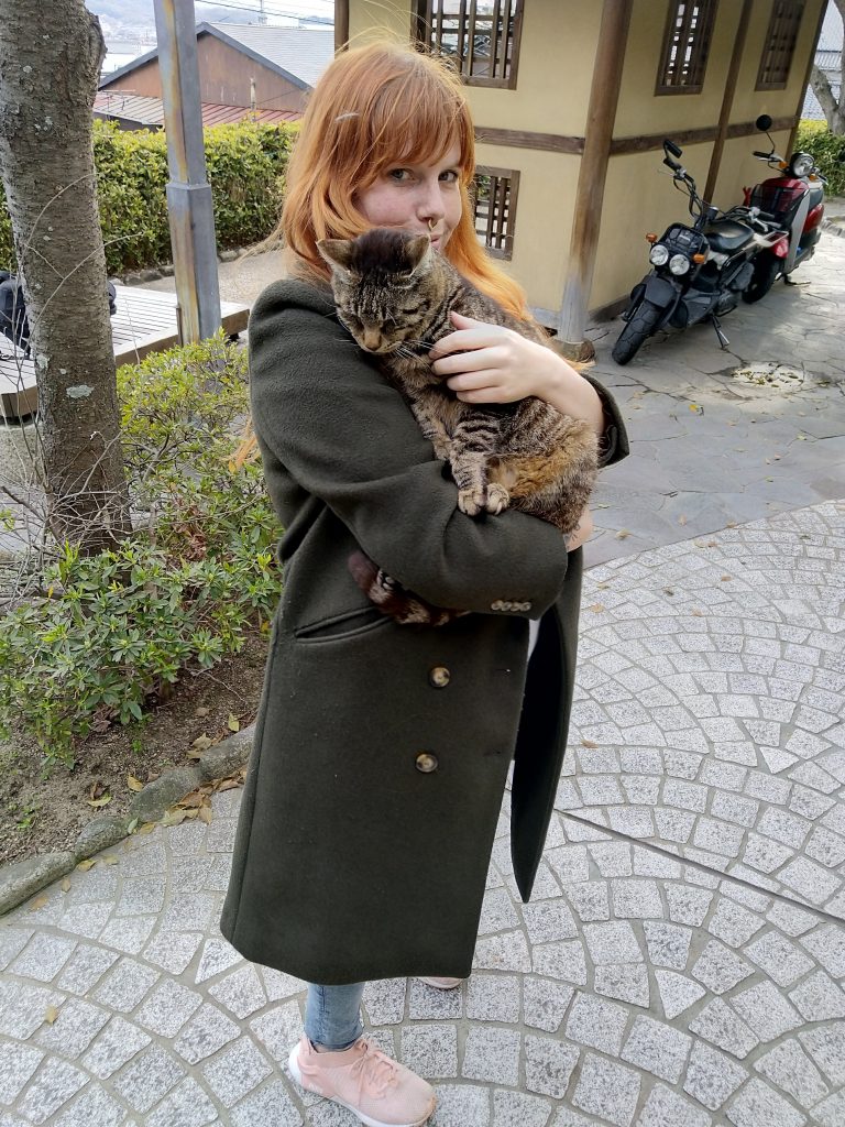 Onomichi ist ein kleines Dörfchen in der Nähe von Hiroshima, welches direkt am Wasser liegt und viele Berge hat. Dort gibt es einen Weg, den Temple Walk, der 25 Tempel umfasst, und das sind nicht alle Tempel dieser Stadt. Ausserdem soll die Stadt für ihre vielen Katzen berühmt sein, was ein Grund unseres Besuches dort ist. Man merkte der Stadt aber auch an – unter anderem durch die vielen leerstehenden Häuser – dass sie für junge Japaner eher uninteressant zu sein scheint, und sich nicht mehr groß weiterentwickelt. Vom Bahnhof aus konnte man einiges an Hafenindustrie sehen. Bei der Begutachtung des Städtchens im Internet habe ich mir nicht viel dabei gedacht, als ich die besiedelten Berge vom Bahnhof aus gesehen habe, wurde mir aber doch leicht anders. Ich nervte Mira eine ganze Weile damit, dass ich umdrehen würde, falls es mir zu viel wird, aber der Anfang unserer Reise verlief gemütlich, hier und da ein paar steile Anhänge, aber alles im Bereich des Machbaren. Die erste Katze begegnete uns auch fast unmittelbar. Die Wege und Treppen waren alle sehr klein und verschachtelt, und es war ein bisschen schwer, sich zu orientieren, aber irgendwann, nahdem wir an einer sehr heruntergekommenen Schule, bei der ich immernoch der Meinung bin, dass sie auch vor Corona schon ihren Betrieb eingestellt hat, vorbeigekommen sind, fanden wir den Tempelweg.