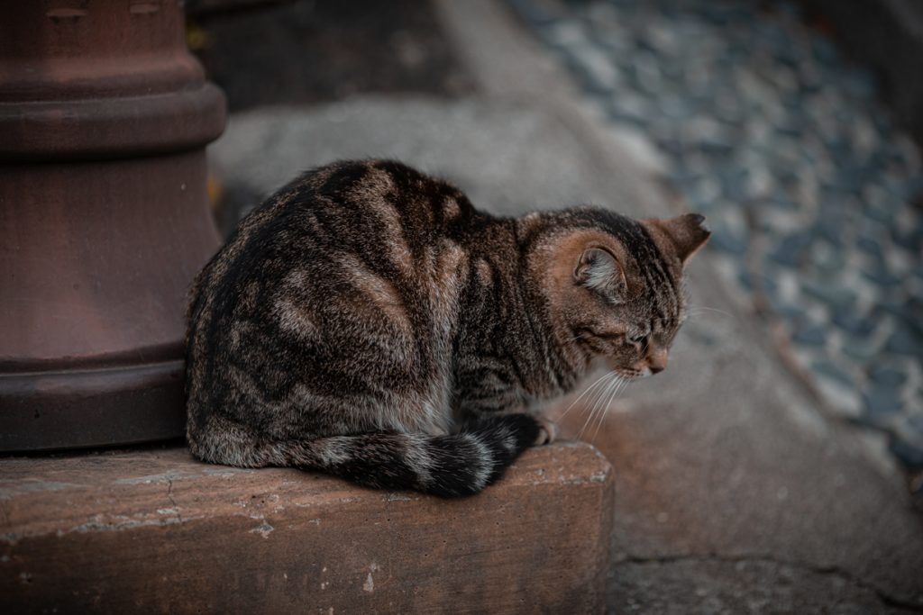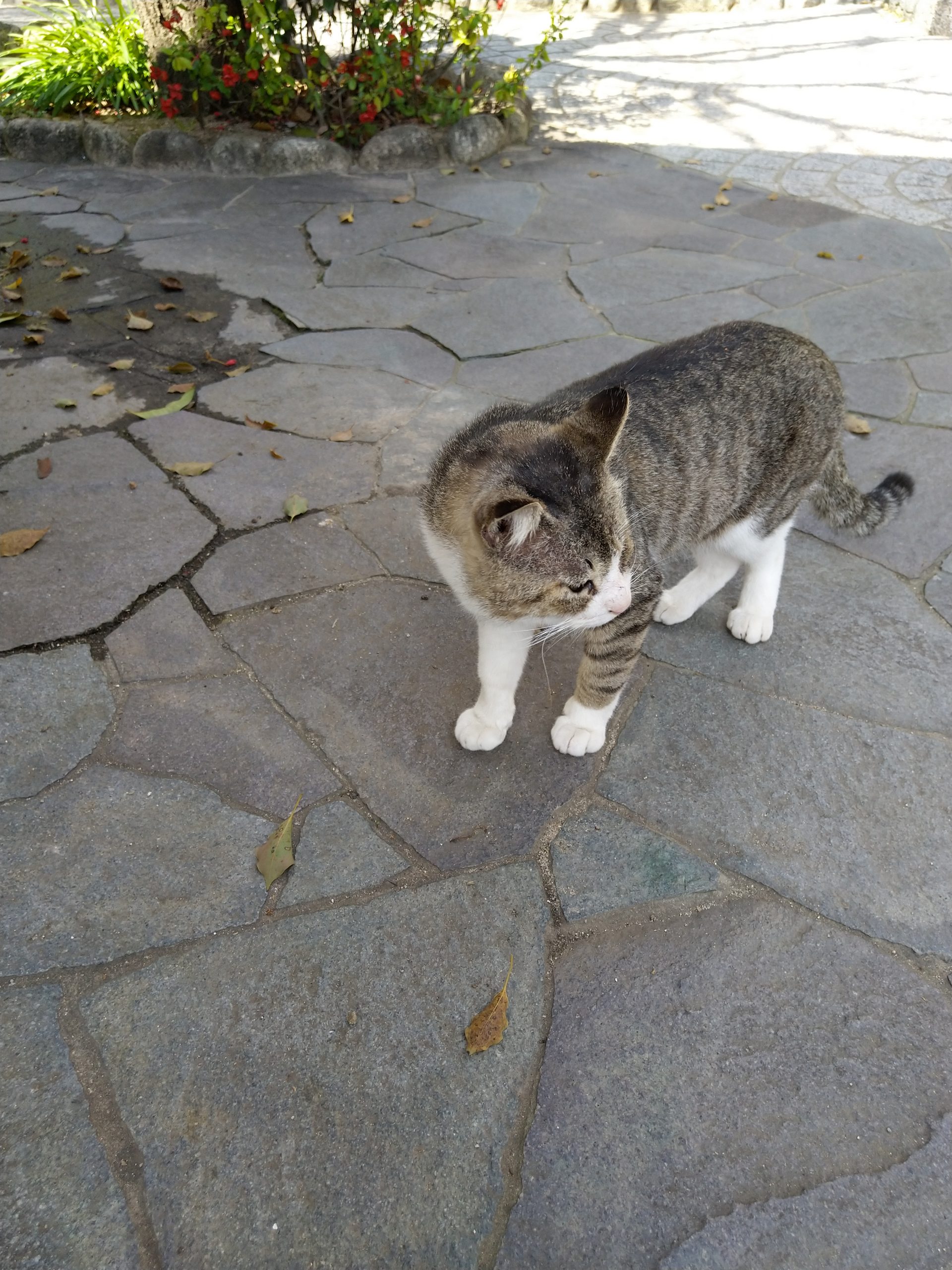 Als wir die zweite Karte entdeckten, die vor einem Haus saß, hörten wir aus dem Haus eine Stimme, die uns hereinbat. Im Inneren erwartete uns im Wahrsten Sinne des Wortes eine Katzenlady, die dort einen kleinen Shop hatte, in dem sie selbst handgefertigte Figuren von Katzen aller möglicher Art verkaufte. Die Frau selber war sehr freundlich und wir redeten eine Weile lang mit ihr, sie konnte sogar bruchstückhaft deutsch. Mehrere Leute gingen allerdings auch ohne großes Interesse an dem Shop vorbei, in so einer Seitenstraße auf dem Berg ist so ein Shop sicher nicht einfach. Ausserdem kümmert sie sich um einige Streunerkatzen. Nachdem Mira auch eine Figur gekauft hatte, sind wir weitergezogen, um an einem nahegelegenen Rastplatz mit schöner Aussicht mehrere Katzen, darunter sogar eine sehr gepflegte Perserkatze zu entdecken. Dort verbrachten wir einige Zeit und spielten auch mit den