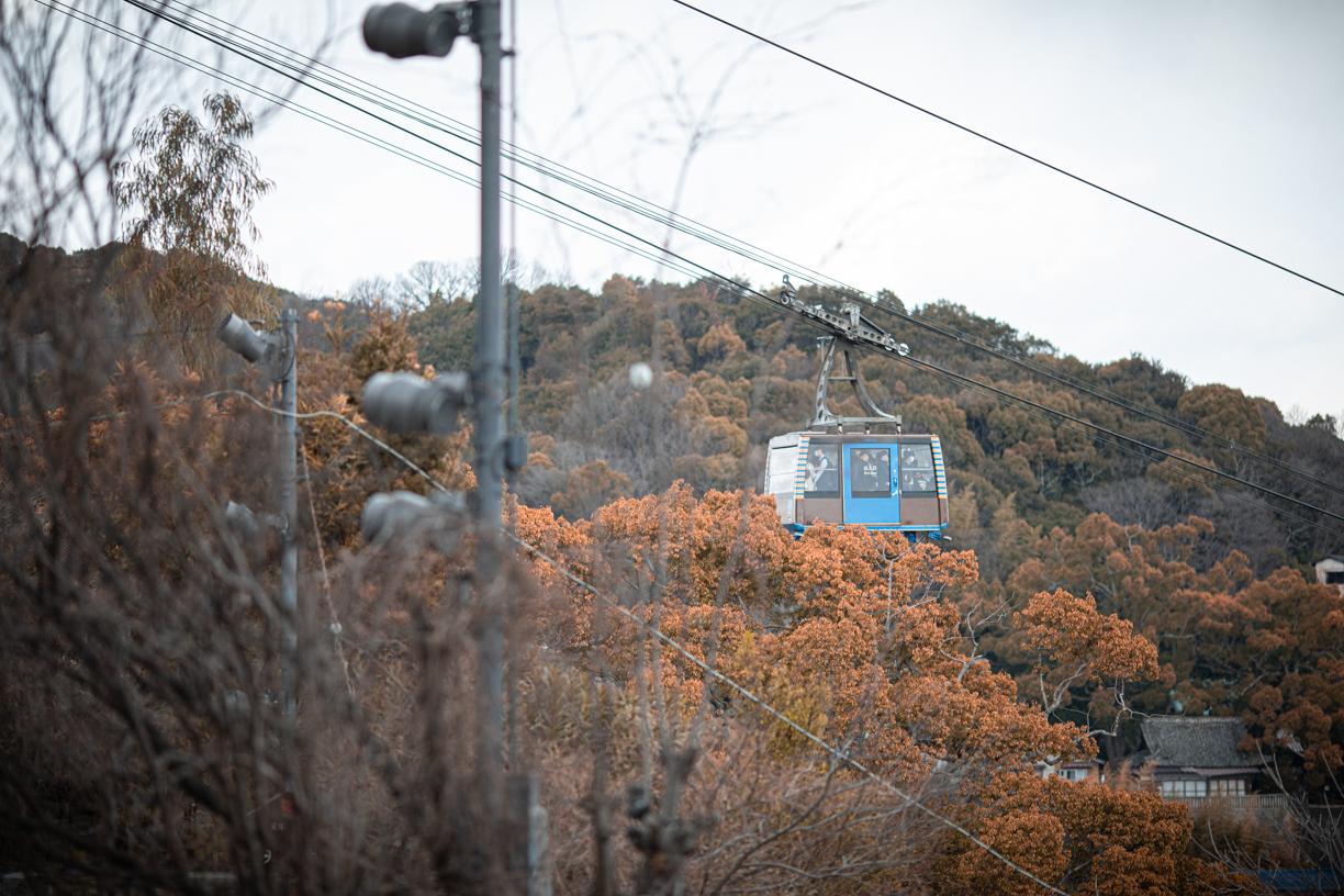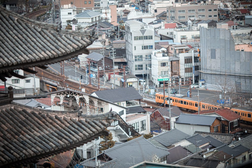 Mira schien das alles wie immer nichts auszumachen, sie machte vom Rand aus weiter schön Fotos. Ich selber musste mich beruhigen und die vor mir liegende Steinwand betrachten, damit es nicht noch schlimmer wurde. Da es bis zum nächsten Tempel noch ein ganzes Stück mehr Treppen war, und dort wohl auch der Zielpunkt der Seilbahn war, Mira auch nicht mehr so weit wandern wollte – immerhin war das ständige Bergauflaufen anstrengend – und mich auch nicht allein lassen wollte, entschieden wir uns umzudrehen. Wir haben zuerst einen Weg genommen, der sicherer als die Unmengen Treppen zu sein schien, mussten nach ein paar Minuten aber umdrehen, da dieser Weg noch schlimmer für mich wurde. Langsam die Unmengen an Treppen am Geländer heruntersteigend haben wir irgendwann endlich wieder sicheren Boden erreicht und sind einen großen Teil des Weges erst einmal an der Hauptstrasse entlang gegangen. Zum Schluss haben wir uns entschieden nochmal kurz zur Bäckerei und den ersten Rastplatz zu gehen, um uns dann auf den Weg zum Bahnhof zu machen, zum Glück, denn es wurde sehr schnell sehr windig und regnerisch.