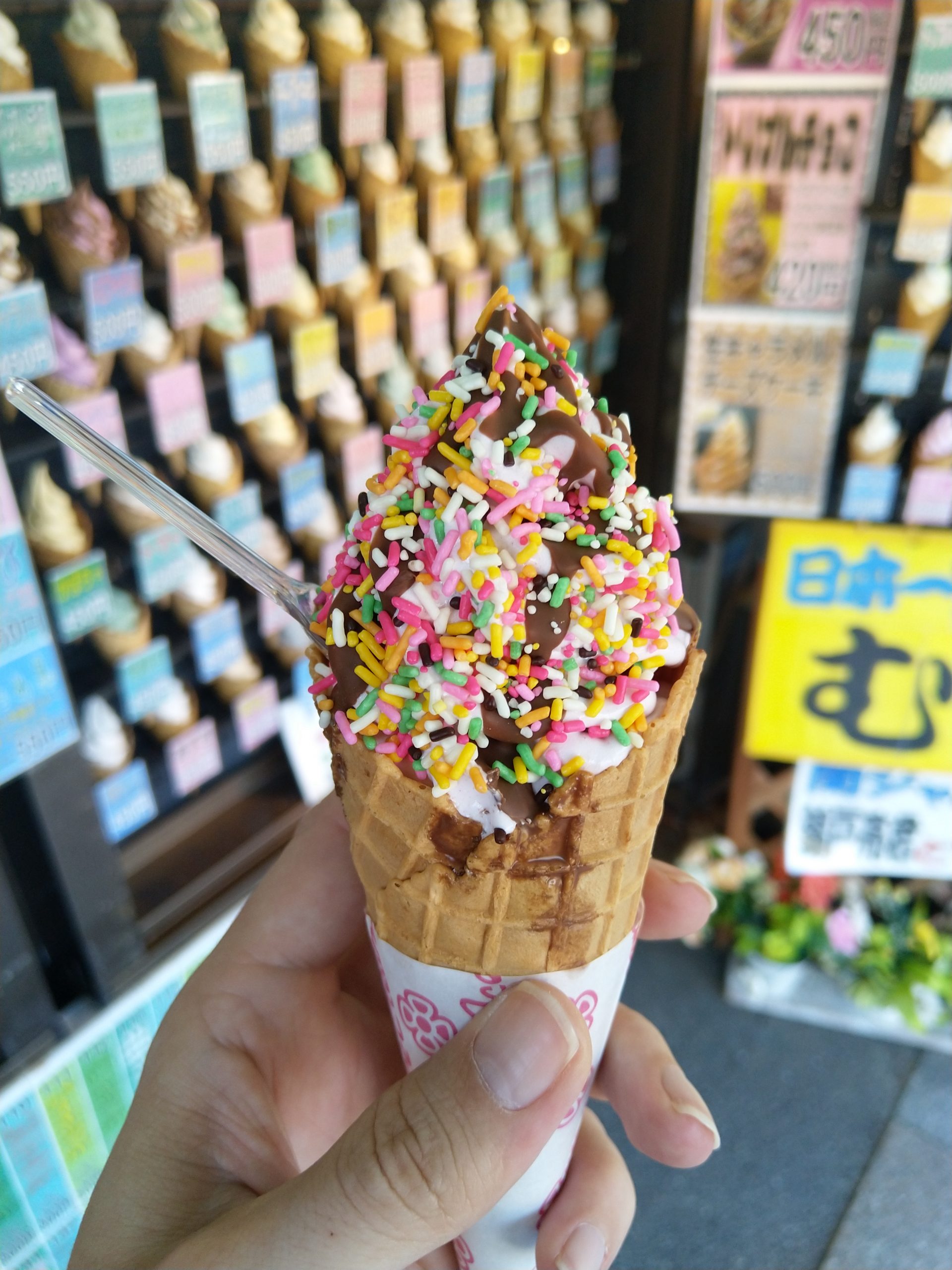 Lustigerweise kostete das Überqueren der Brücke Geld. Einmal für beide Wege. Hinter der Brücke war ein großer Park mit mehreren kleinen Gärten, einem Friedhof, Museen, und der Seilbahn auf den Berg hinauf. Am Eingang des Gartens waren 3 Softeisstände am Stück. Einer betitelte sich als bester Softeisladen Japans und hatte gefühlt 100 Sorten. Wir sind ein bisschen durch den Park spazieren gegangen, der stellenweise echt schön war, sind in das weiße Schlangenmuseum gegangen, welches aus einem Raum mit Terrarium und ein paar Infos bestand, das andere Museum hatte wegen Corona leider zu. Die Gärten waren offen, aber sehr klein und enttäuschend.