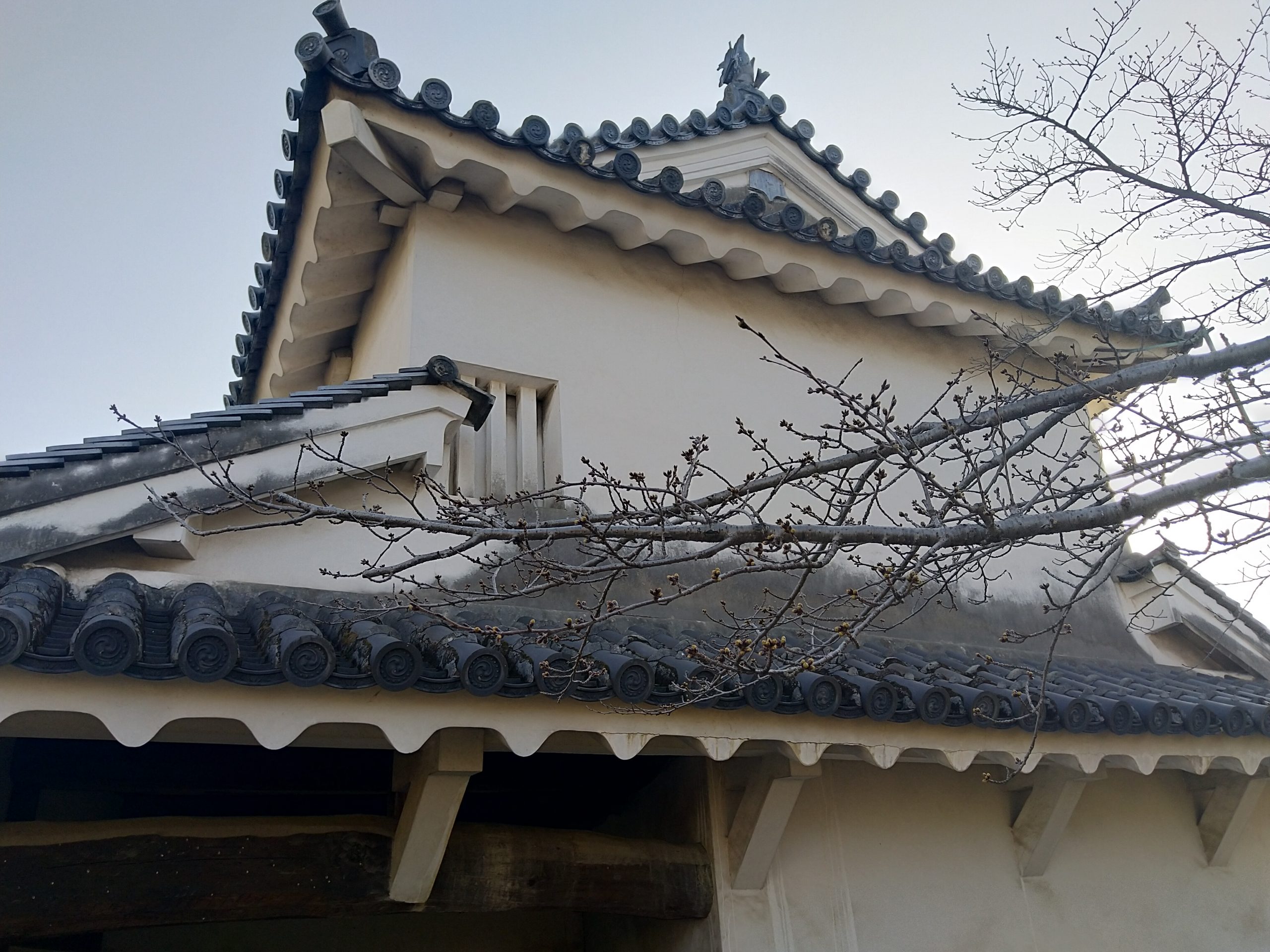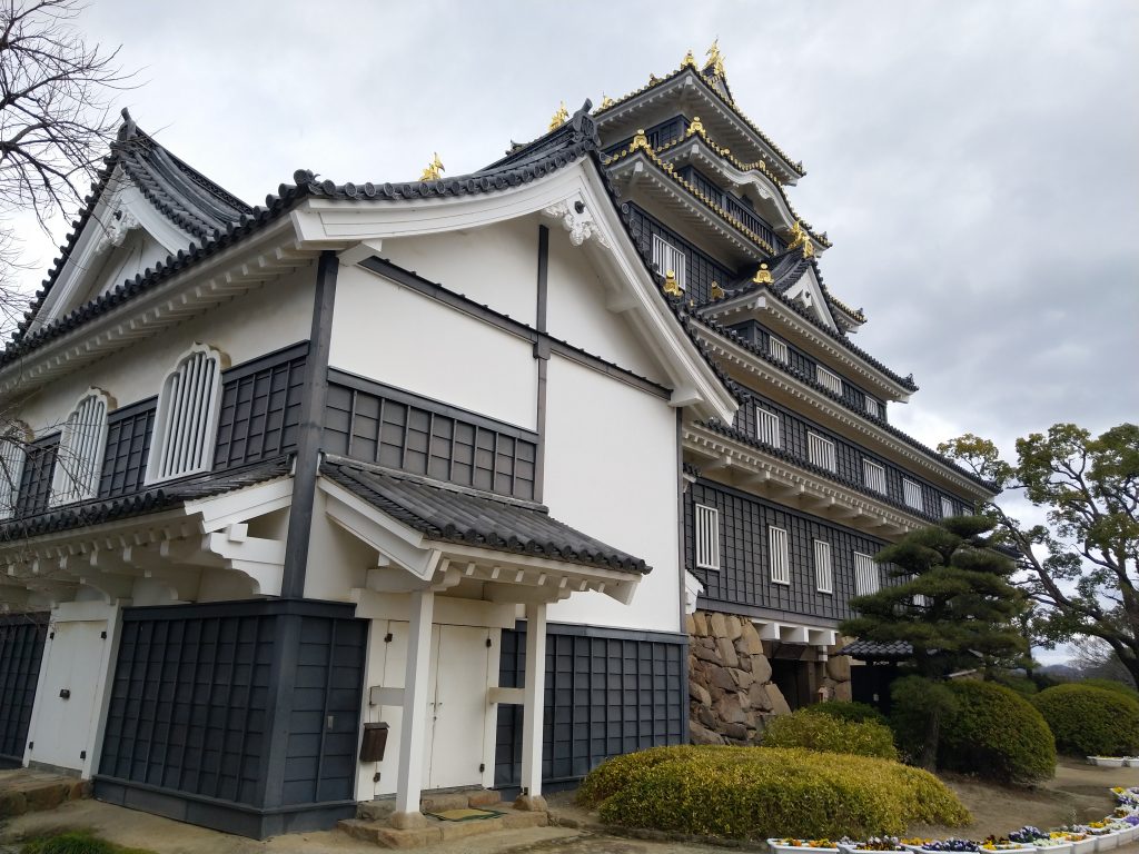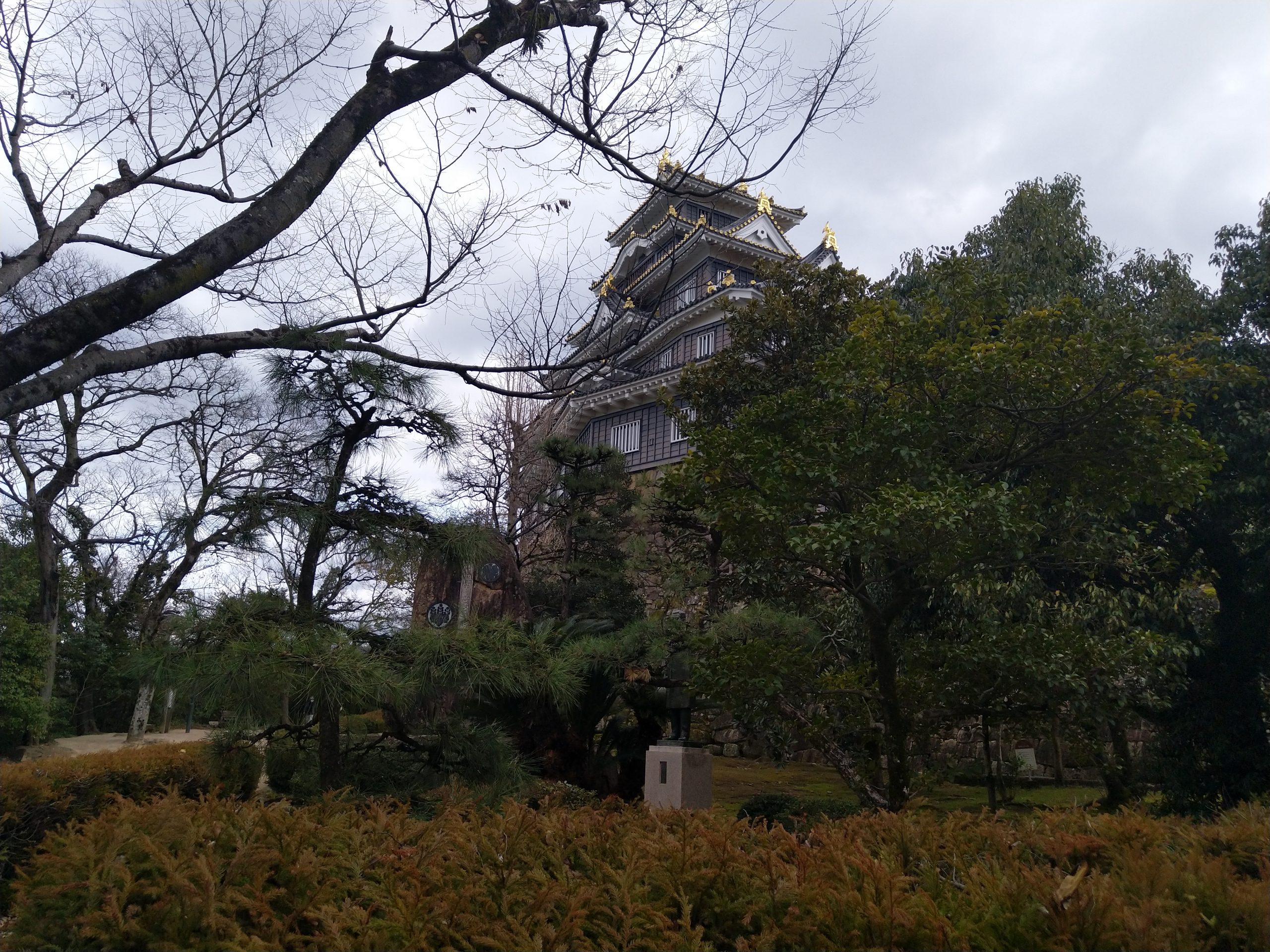 Einen Tag Zeit haben wir für Okayama eingeplant. Okayama ist unter anderem die Stadt, aus der die Legende von Momotaro, dem Jungen aus dem Pfirsich stammt, was man an einigen Ecken auch gemerkt hat. Am Vorabend haben wir die Stadt bei Nacht gesehen, welche einen schönen aber auch leicht gefährlichen Eindruck gemacht hatte – unser Hotel und der Bahnhof waren von einer Partymeile getrennt. Als wir morgens loszogen, wirkte die Stadt um so ruhiger. Okayama hat nicht so viel Sehenswürdigkeiten, weshalb wir alles etwas ruhiger angehen konnten. Darum haben wir uns auf dem Weg zum Schloss auch erst einmal durch Quatschen ein wenig verlaufen, wodurch wir einen Umweg an dem Fluss in Okayama machen konnten. Kurz vor dem Schloss fing es leider wieder an zu regnen, was uns bei der Besichtigung des Schlosses aber nicht störte.