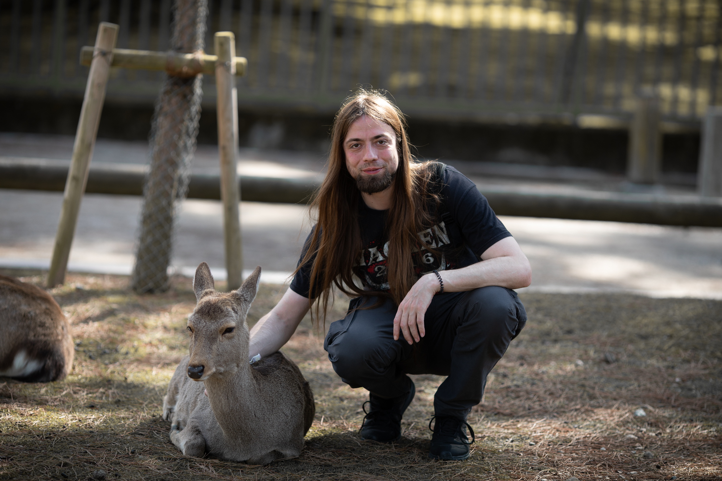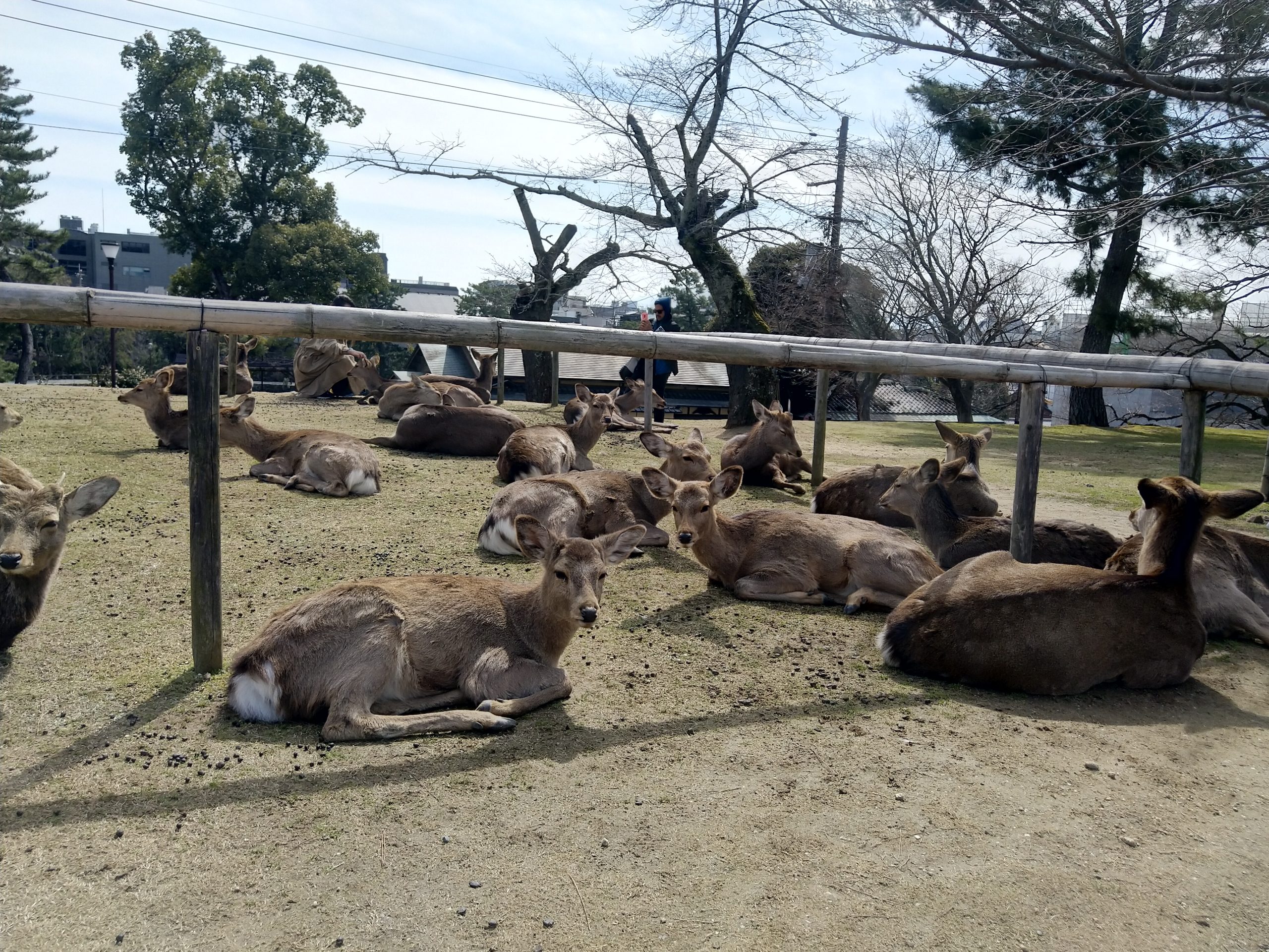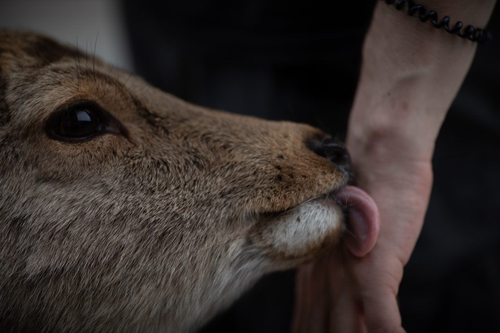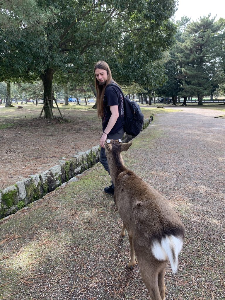 In den meisten Teilen der Stadt laufen Rehe frei rum. Nicht nur das, sie sind zahm und scheuen auch keine Menschen. Ganz im Gegenteil, sie erwarten, dass man sie füttert. Deswegen verlieren sie auch leider schnell das Interesse, wenn man ihnen kein Futter gibt (welches man natürlich bei den dort verstreuten Händlern und Automaten kaufen sollte, da mitgebrachtes Futter eventuell nicht gesund für die Tiere ist). Wenn man sich verbeugt, verbeugen manche sich sogar auch (Eine übliche Geste in Japan)! Wenn sie allerdings Leute mit Futter entdecken, dann werden sie fast schon zu aufdringlich. So haben ein paar Rehe Mira fast umgestoßen, als sie sie füttern wollten. Die Rehe sind aber natürlich nicht das einzige, was Nara zu bieten hat. An den Rehen vorbei haben wir uns auf dem Weg zu einem wunderschönen Garten, dem Yoshikien, gemacht, der uns beiden sehr gut gefallen hat.