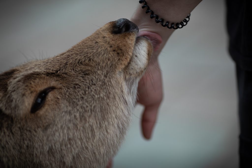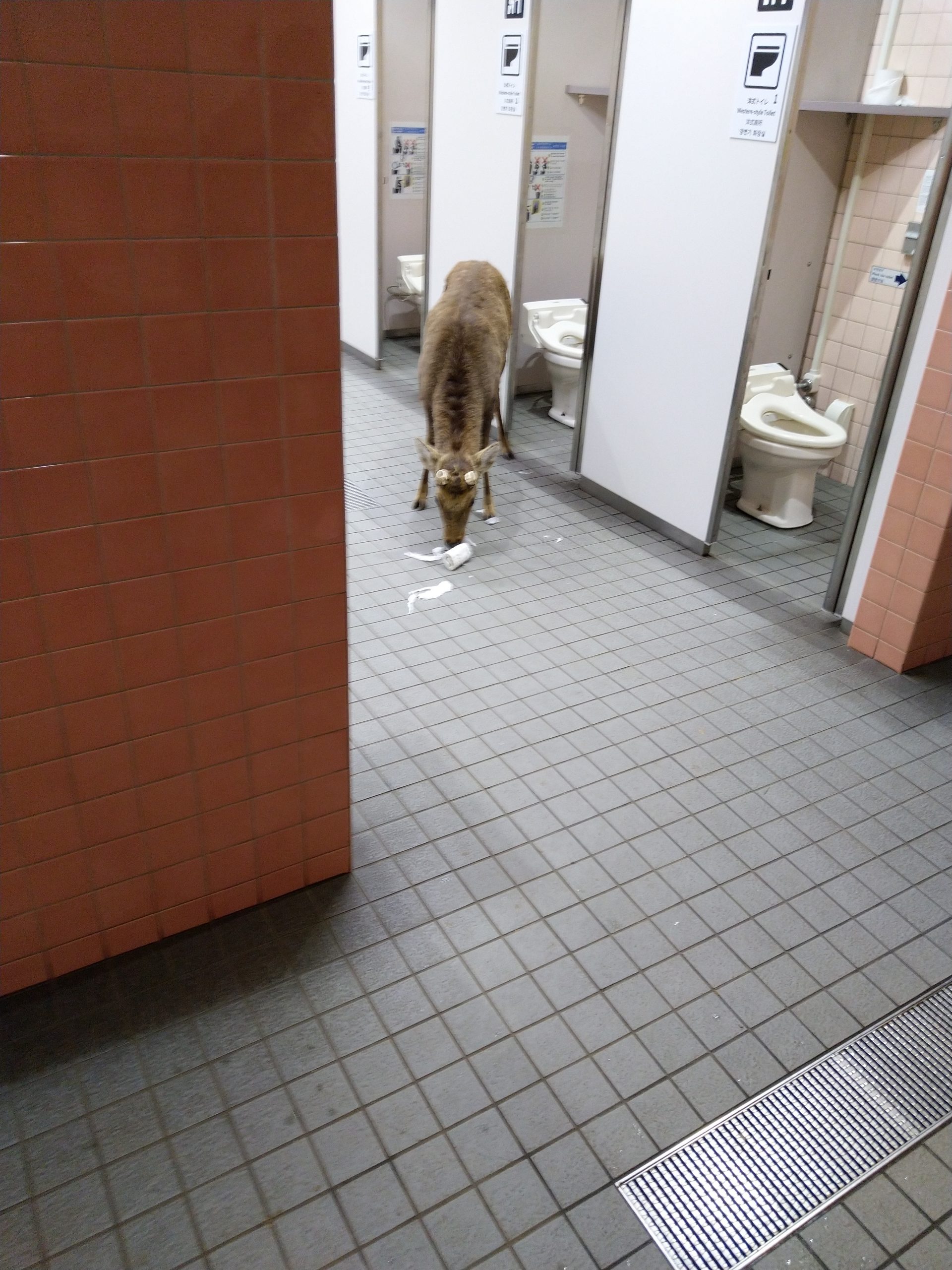 Das fand es eine ganze Weile lang toll, bis jemand vorbeigelaufen ist, und das Reh sofort ohne Zögern abgelassen hat und dem Mann gefolgt ist. Dieser fütterte die Rehe, wie ich später entdeckte – und wohl nicht zum ersten Mal. Auch Mira hatte eine lustige Begegnung mit einem Reh. Als sie auf die Toilette ging, hörte ich sie laut schreien – auf ihr Drängen hin bin ich mit ihr auf die Damentoilette, um das zu entdecken: