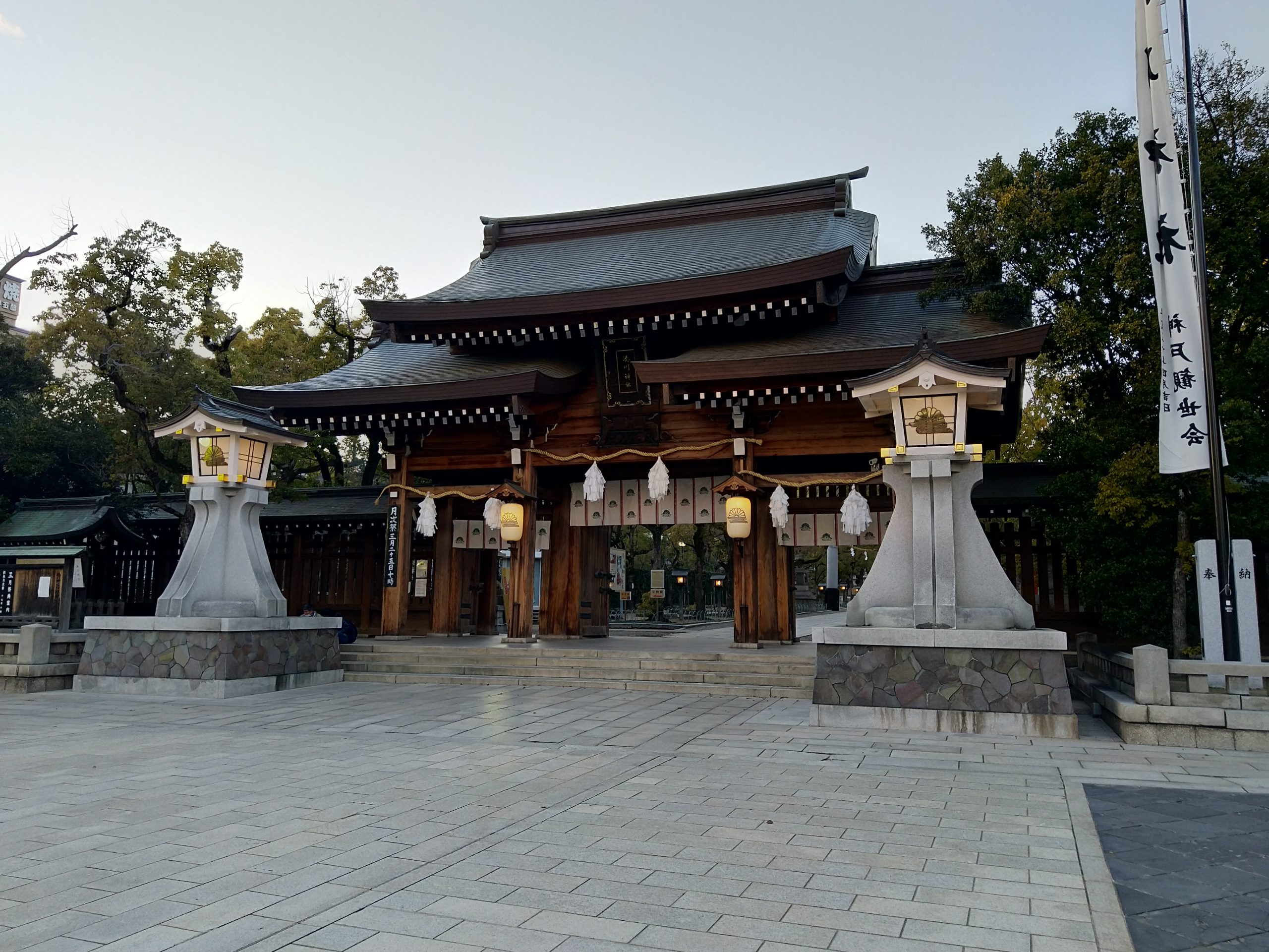 Leider wurde dieser schöne Tag sehr getrübt, als sich das Band von Miras Kamera gelöst hat und diese auf den Boden geknallt ist. Ich habe es nur Knallen gehört und ein paar Stücke der Gegenlichtblende durch die Gegend fliegen sehen. Die Kamera hat zum Glück keinen Totalschaden, was allerdings alles kaputt ist, wissen wir noch nicht. Auf jeden Fall hat sie einige Schäden davongetragen. Unser eigentlicher Plan, noch zum Fushimi Inari zu fahren fiel damit leider ins Wasser – wobei das zeitlich so oder so knapp geworden wäre. So sind wir nur noch zum letzten Schrein des Philosophenweg, der lustiger- und unpassenderweise Getränkeautomaten und Aschenbecher hatte, und haben uns über den Bahnhof und den Kyoto Tower vorbei auf den Weg zum Hotel begeben.