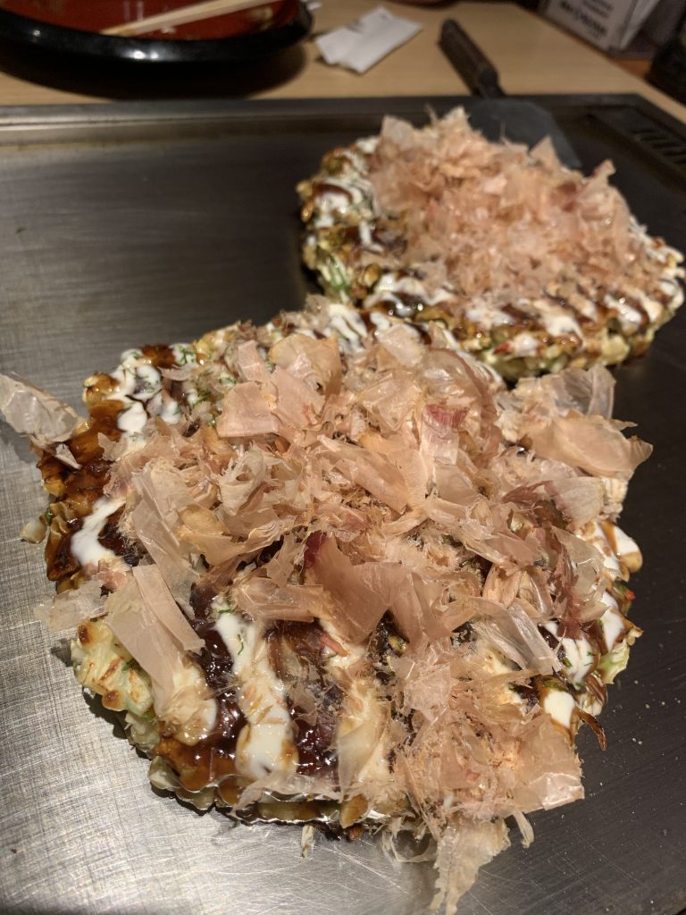 Dort haben wir ein wenig geshoppt und sind danach auf die berühmte Dotonbori gegangen, wo es Restaurants wie Sand am Meer gibt. In Osaka – so sagt man – gibt es japanweit die beste Küche. Wir haben uns hier für Okonomiyaki entschieden.