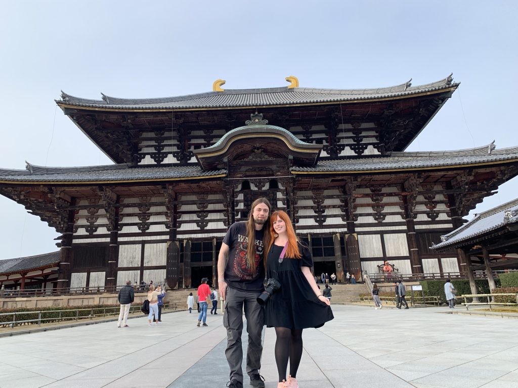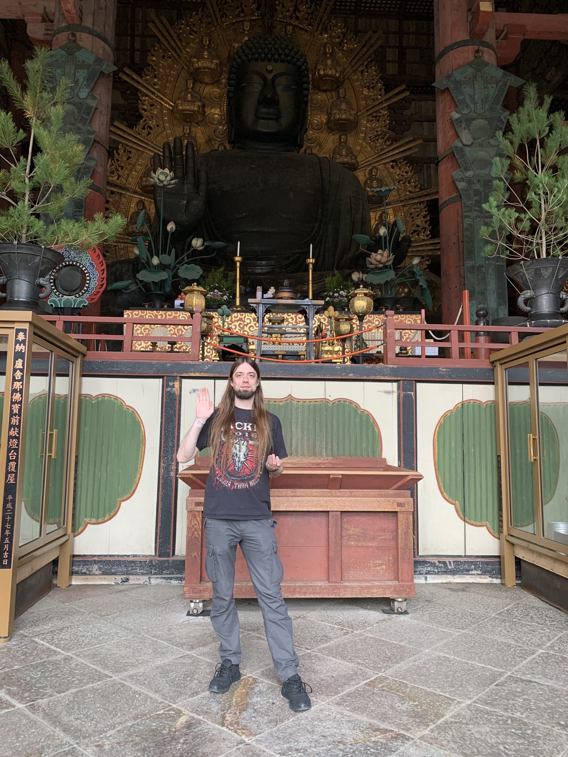 Hinter dem Park liegt der Todai-ji, ein Tempel mit der wohl größten Buddha Statue, die ich jemals gesehen habe. Leider bringen Fotos die wirkliche Größe auch nicht sehr gut rüber, aber die Halle in der er steht ist 57,01 Meter hoch und der Buddha selber 14,98 Meter. Allein sein Ohr ist schon 2,54 Meter hoch!